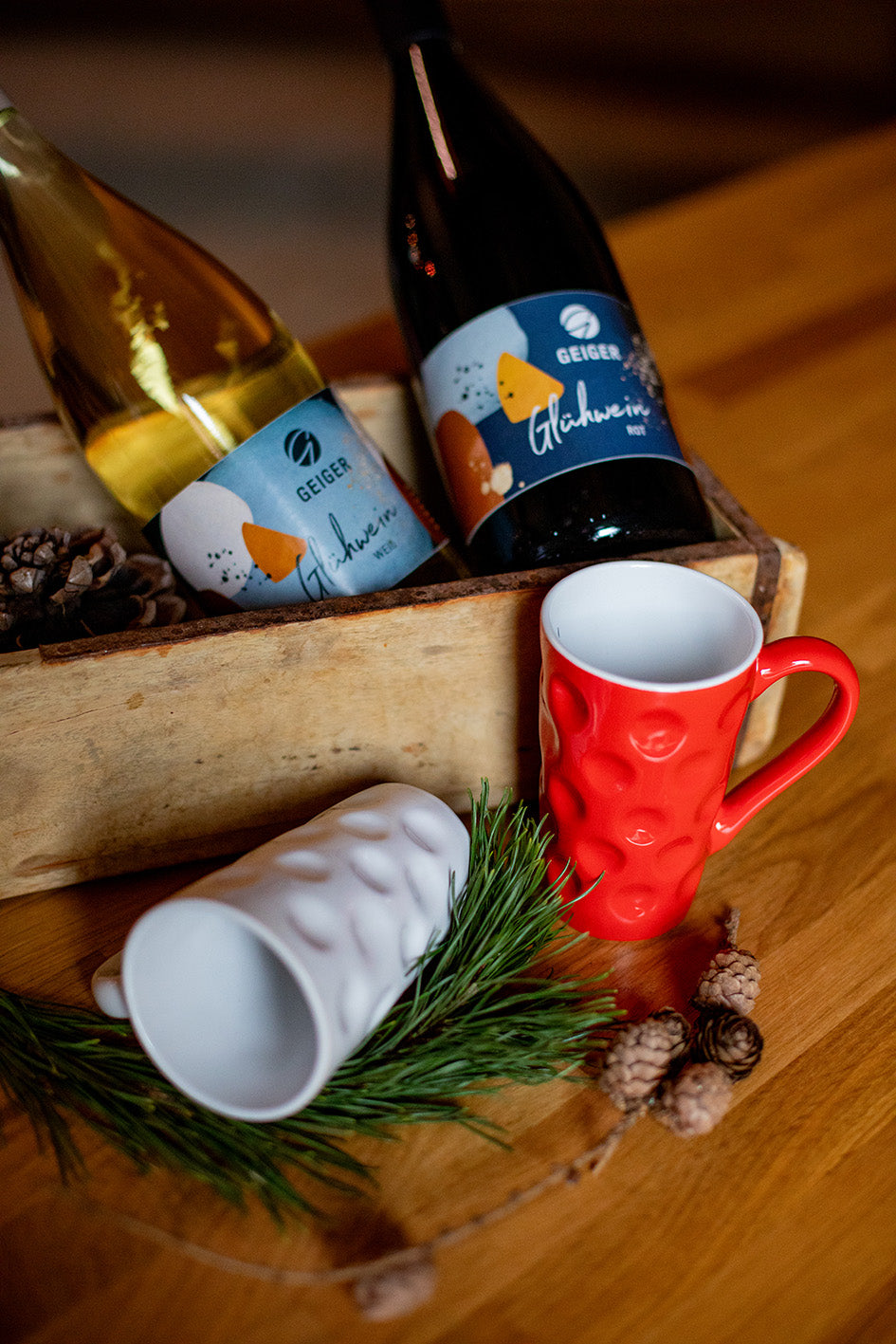 Glühwein rot und weiß für das Weihnachtsmarktgefühl im Wohnzimmer. Dazu gibt’s die passenden Dubbetassen in Weiß & Rot – stilecht genießen wie auf dem Pfälzer Weihnachtsmarkt.